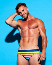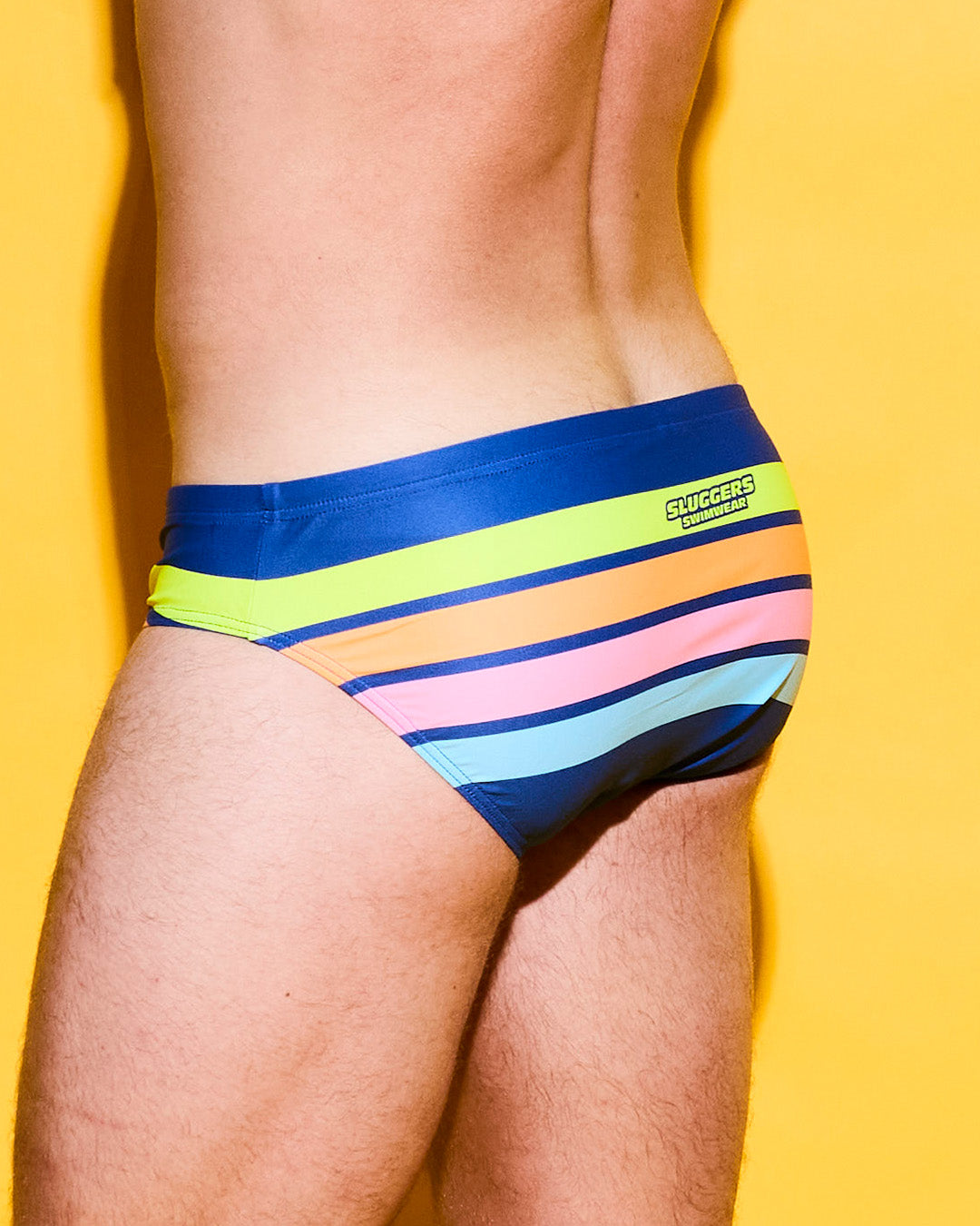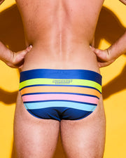 Our Bright AF Collection SUNSET print features a bright navy base with neon pink, orange and yellow stripes.